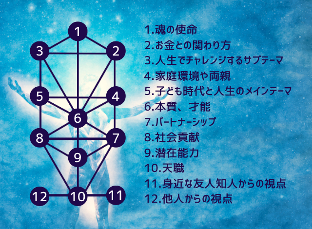 誕生日、出生時刻、出生地から12個の丸(スフィア)にスピリットカラーを導き出し、生命の樹を紐解いていきます。